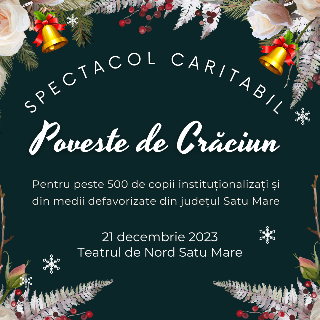 Asociația Acces La Viitor în colaborare cu Teatrul de Nord Satu Mare și Școala Gimnazială ,,Avram Iancu” Satu Mare, organizează joi, 21 decembrie 2023, de la ora 12.00, spectacolul caritabil pentru copiii instituţionalizaţi și cei din medii defavorizate, ,, Poveste de Crăciun”.
